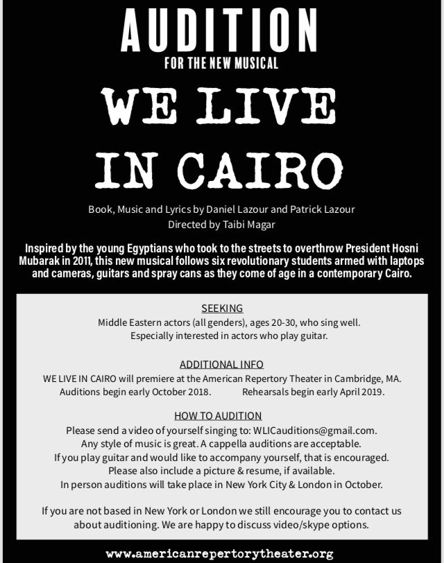 Writer Arab American Casting on the subject line. WE LIVE IN CAIRO is a new musical making its world premiere at the American Repertory Theater in Cambridge, MA. Under the direction of artistic director Diane Paulus, the A.R.T. has become an incubator for pre-Broadway productions (recent Broadway shows that began at A.R.T. include Waitress, Pippin, All the Way, Porgy and Bess & Once). Inspired by the young Egyptians who took to the streets to overthrow President Hosni Mubarak in 2011, WE LIVE IN CAIRO follows six revolutionary students armed with laptops and cameras, guitars and spray cans as they come of age in a contemporary Cairo.